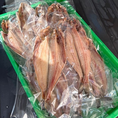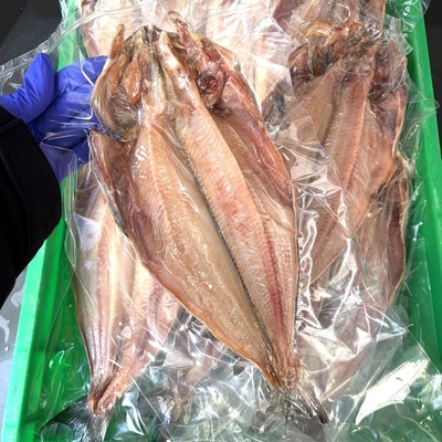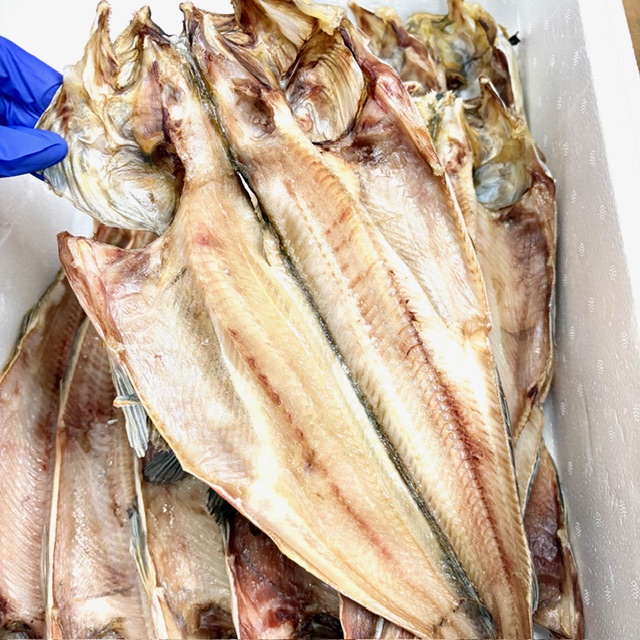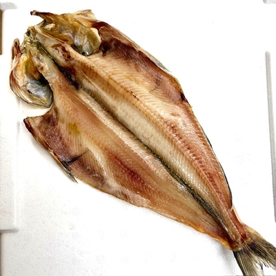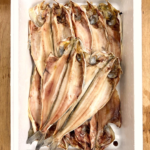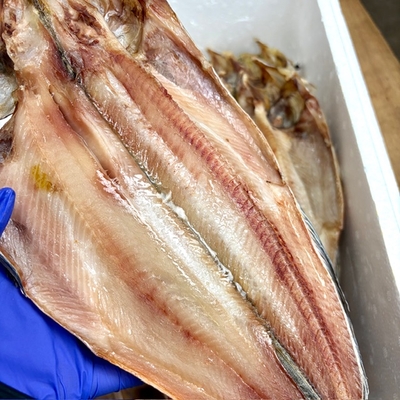 脂ののった北海道産の真ほっけを、1枚1枚丁寧に手作業で捌き、干し上げています。天然の脂がたっぷりと滲み出てくる本商品は、当店で毎週開催される【干物デー】でも大人気。